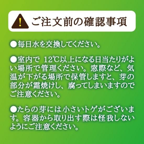 ・たらの芽には小さいトゲがございます。容器から取り出す際は怪我しないようにご注意ください。
