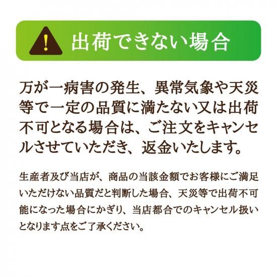 ・万が一病害の発生、異常気象や天災等で一定の品質に満たない又は出荷不可となる場合は、ご注文をキャンセルさせていただき、返金いたします。