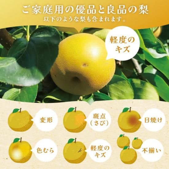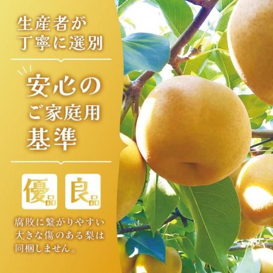 梨の腐敗に繋がりやすい大きな傷などは本商品には含みません。生産者が1玉ずつ検品して箱詰めしています。無選別ではありませんのでご安心ください。極まれに痛みが進んだ梨が届くこともございますが、輸送中の振動によるものであるため、この点ご了承ください。
