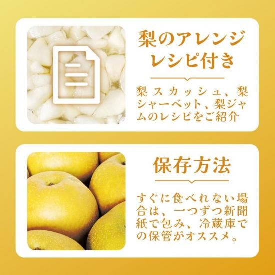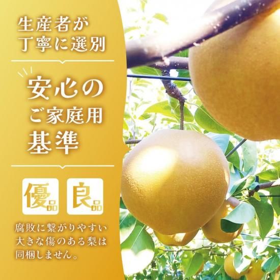 梨の腐敗に繋がりやすい大きな傷などは本商品には含みません。生産者が1玉ずつ検品して箱詰めしています。無選別ではありませんのでご安心ください。極まれに痛みが進んだ梨が届くこともございますが、輸送中の振動によるものであるため、この点ご了承ください。
