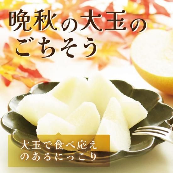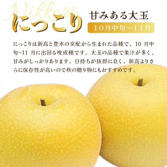 にっこりは新高と豊水の交配から生まれた品種で、10月中旬〜11月に出回る晩成種です。大玉の品種で果汁が多く、甘みがしっかりあります。日持ちが抜群に良く、新高よりさらに保存性が高いので秋の贈り物にもおすすめです。