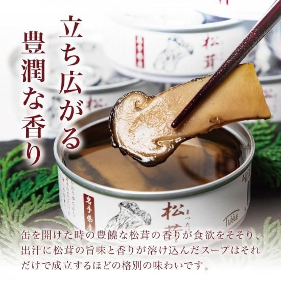 香り高い国産の松茸を丁寧に手作業で缶詰にした一缶です。缶を開けた時の豊饒な松茸の香りが食欲をそそり、昆布だしと塩だけで味付けしたスープはそれだけで成立するほどの格別の味わい深さです。貴重な岩手県産の松茸水煮は、お祝いや記念日などに炊き込みご飯、お吸い物などにしてお楽しみください。