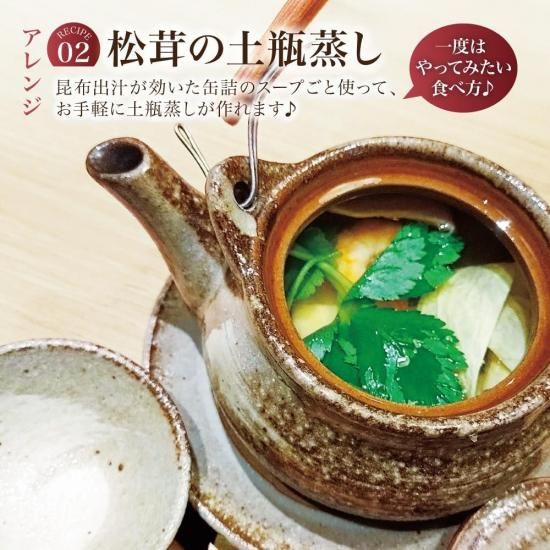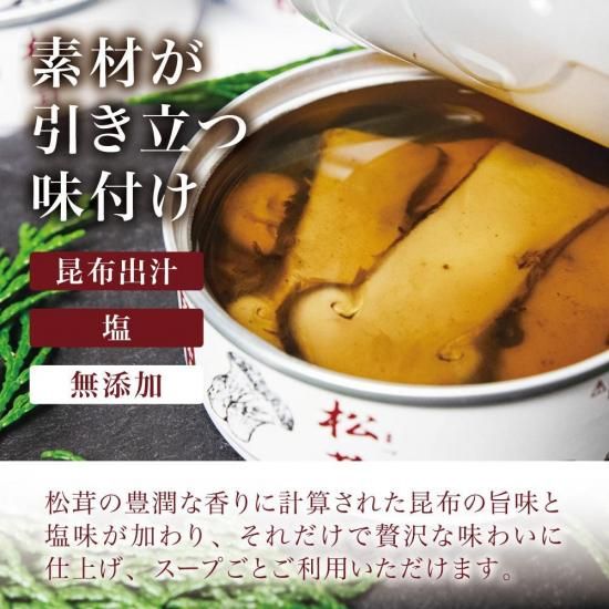 松茸の素材本来の味わいや風味を生かすために、味付けには昆布出汁と塩のみを使用しています。松茸の豊潤な香りに計算された昆布の旨味と塩味が加わり、それだけで贅沢な味わいに仕上げています。無添加で松茸そのものの美味しさが詰まった一缶です。