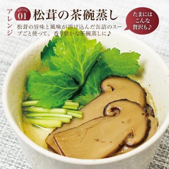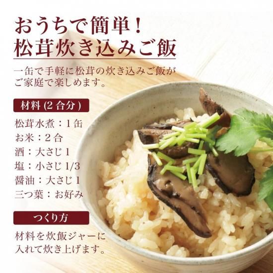 一缶で手軽に松茸の炊き込みご飯がご家庭で楽しめます。缶詰一缶をお米2合に加え、酒大さじ1、塩小さじ1/3、薄口しょうゆ大さじ1を入れて炊飯ジャーで炊き上げます。油揚げを加えたり、三つ葉を飾っても美味しく召し上がれます。