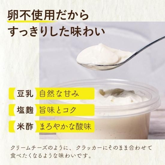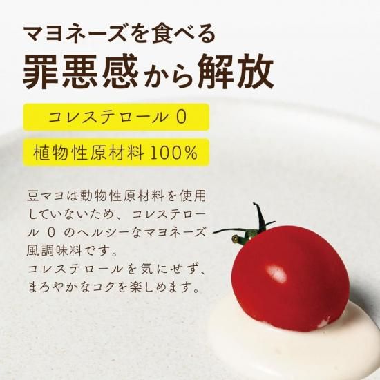 豆腐屋さんの豆達人がつくる大豆由来のマヨネーズ風味調味料です。卵不使用で製造し、大豆・米油・米酢・塩麹だけを使用しているため、ビーガンの方も安心して召し上がれます。動物性原材料不使用のコレステロール0のヘルシーさは、マヨネーズを食べる時の罪悪感から解放してくれます。豆の選定から豆達人がこだわった豆マヨをぜひお試しください。