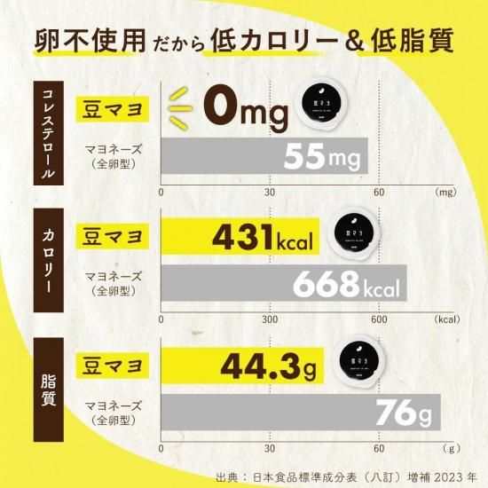 動物性の原材料を使わず無添加で仕上げた豆マヨは、一般的なマヨネーズよりも低カロリーな上に低脂質なのが特徴です。その他にも以下のような多くの特徴があります。