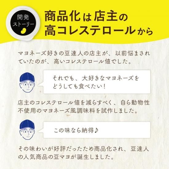 以前に豆達人の店主が悩まされていたのが高いコレステロール値。店主のコレステロール値を減らすべく、自ら動物性不使用のマヨネーズ風調味料を試作しました。マヨネーズ好きの店主も納得の味に仕上がると、その味わいが好評だったため商品化され、人気商品の豆マヨが誕生しました。