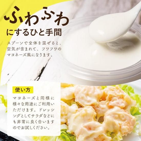 ご利用の際にスプーンで全体を混ぜると、空気が含まれて、よりフワフワのマヨネーズ風になります。使い方はマヨネーズと同様に様々な用途にご利用いただけます。ドレッシングとしてサラダなどにも非常に良く合いますのでお試しください。