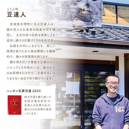 豆達人の店主であり豆腐マイスターの藤原竜二氏は、店頭に立つ傍ら日々豆腐の研究を欠かしません。評判の豆腐があれば遠方まで足を運び、技術や知識を学び取り入れることで、自店の味に活かしています。その豆腐へのあくなき探究心は豆腐のラインナップの豊富さや受賞歴に反映され、店頭限定の豆乳ソフトをはじめ豆腐スイーツも人気となっています。また、2025年のニッポン豆腐百選には、藻塩にがり絹ととろりおぼろ(七里豆)の2品が選ばれる快挙を達成しています。