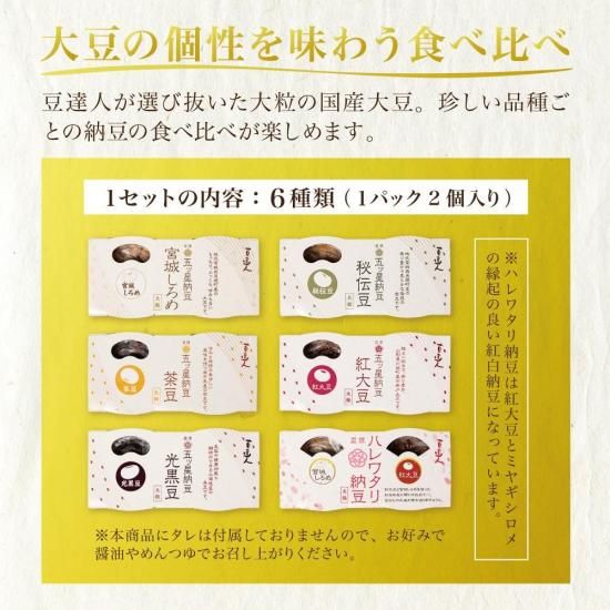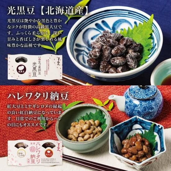 大豆は品種によって味わいや風味が異なります。ぜひ食べ比べてご自身のお好みを見つけてはいかがでしょうか。ハレワタリ納豆は紅大豆とミヤギシロメの縁起の良い紅白納豆になっています。