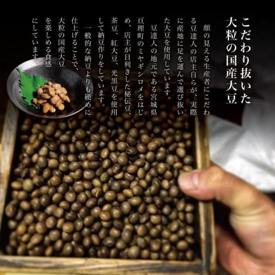 顔の見える生産者にこだわる豆達人の店主自らが、実際に足を運んで選び抜いた国産の大豆を使用しています。どの品種も大粒で食べ応えがあり、大豆の食感が分かるように一般的な納豆よりもやや硬めの仕上がりにしてあります。厳選した個性のある大豆だからこそ、納豆としては珍しい品種ごとの納豆をお届けしています。